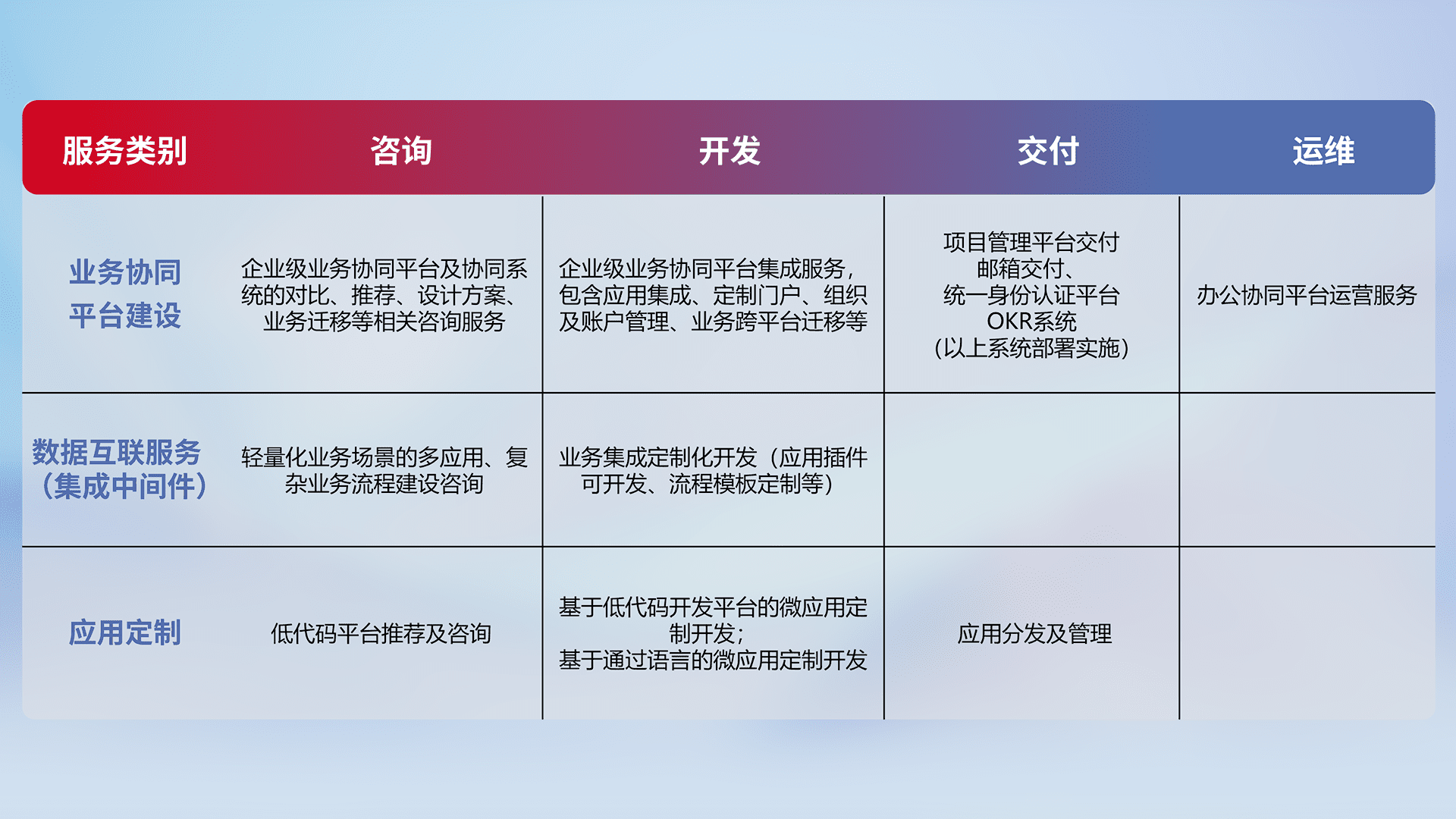 针对钉钉、、、、企微、、、、IDaas等平台级产品提供产品的规划、、、方案、、、交付、、、定制化开发等服务,,实现如统一协同办公、、、、智能客户服务、、混合会议管理、、、、智能数据查询、、、等业务场景,,,实现数字化转型。。。。