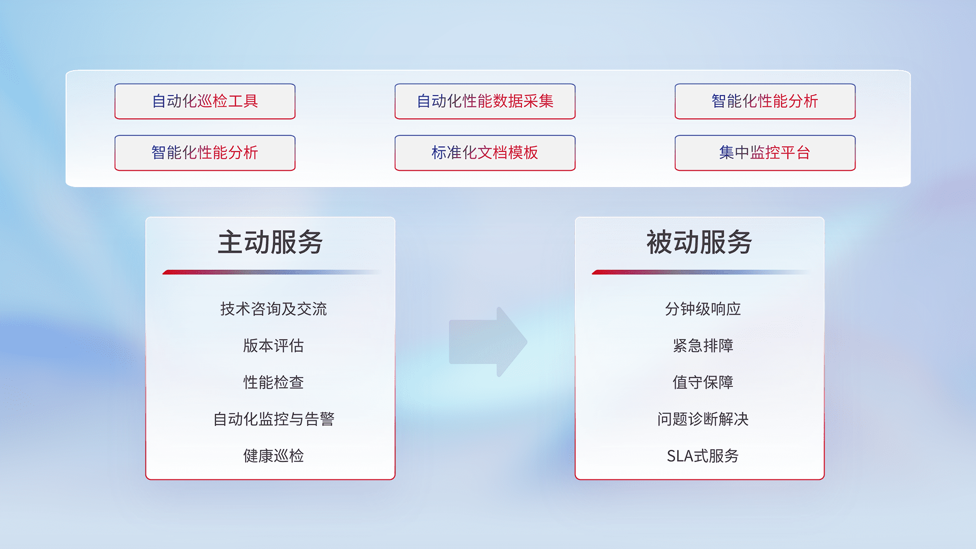 智能化工具和标准化文档,,保障服务质量,,,提供主动服务(包含技术咨询、、版本评估、、性能检查、、自动化监控与告警、、、、健康巡检)和被动服务包含(分钟级响应、、、紧急排障、、、值守保障、、、、问题诊断解决、、、、SLA服务)。。